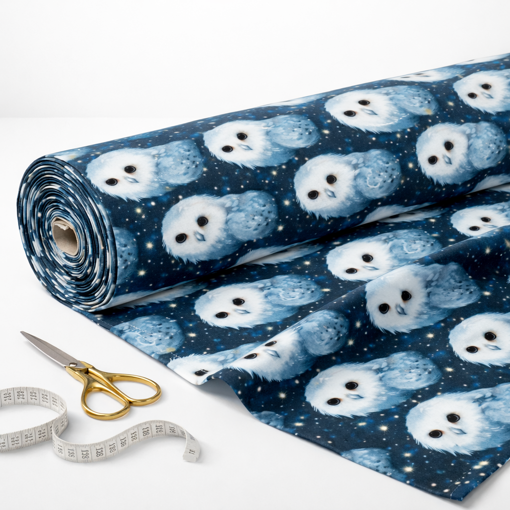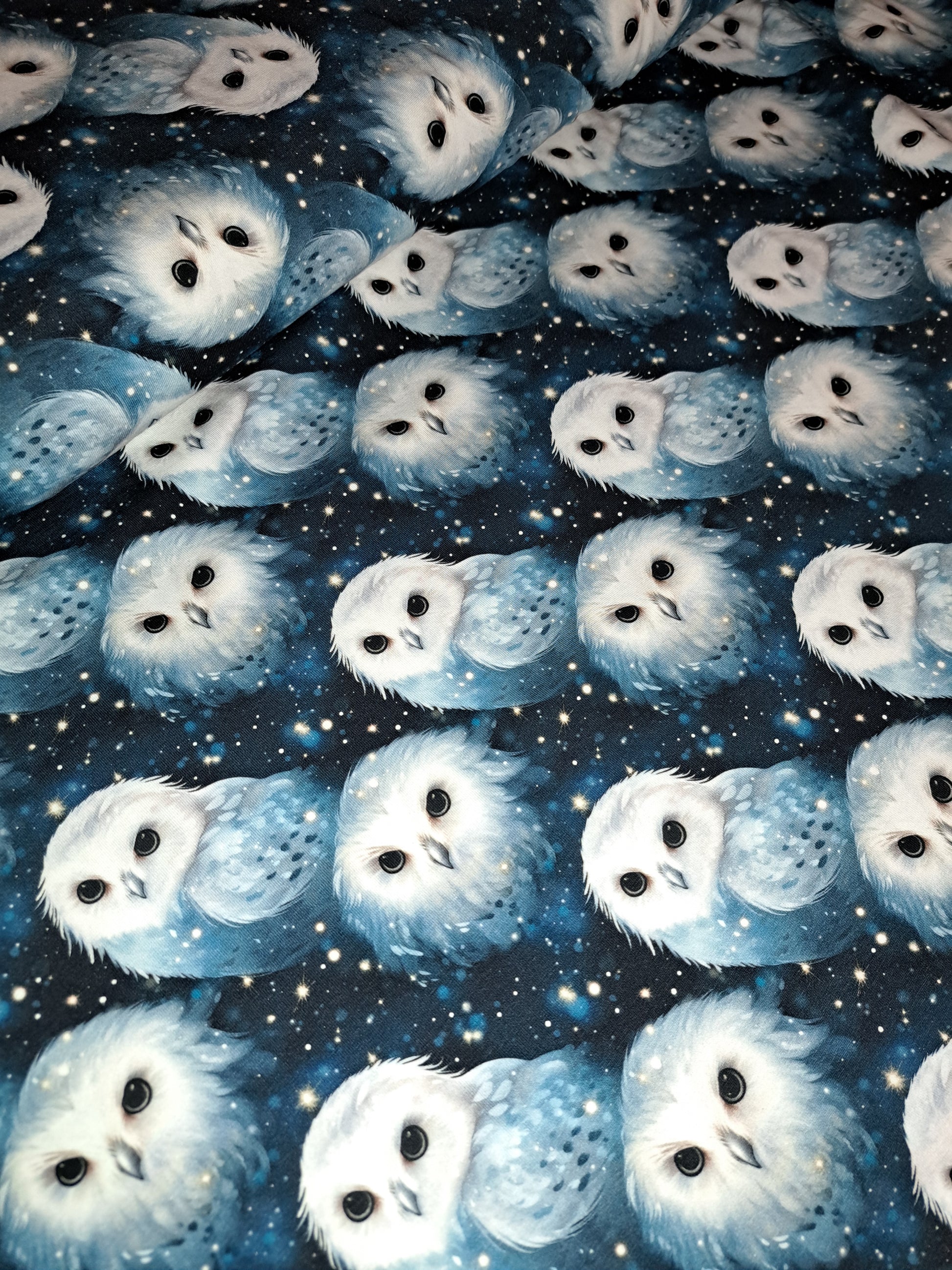 Baumwolljersey weiße Eulen auf nachtblauem Hintergrund